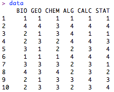 我々が開始する前に、ダウンロードすることをお勧めしますデータセット(.csvファイル)このチュートリアルで使用する。 右クリックして、Rの作業ディレクトリにファイルを保存してください。 このデータセットは、大学生の好きな主題の調査から6項目の300応答の仮想的なサンプルが含まれています。 項目は、強く強く好きに嫌うからスケールを表すか、1から5の値にまで及びます。 私達の6項目は、生物学(BIO)、地質(GEO)、化学(CHEM)、代数(ALG)、微積分(CALC)、および統計(STAT)を含むさまざまな大学の主題分野、彼らの好みを評価する学生に尋ねた。 すべての学生が、それによってEFAを(冗談です)実施するための不十分な分散をレンダリングする、すべてのこれらのコンテンツ領域の強嫌いと評価されるため、このチュートリアルでは、終わるところです。