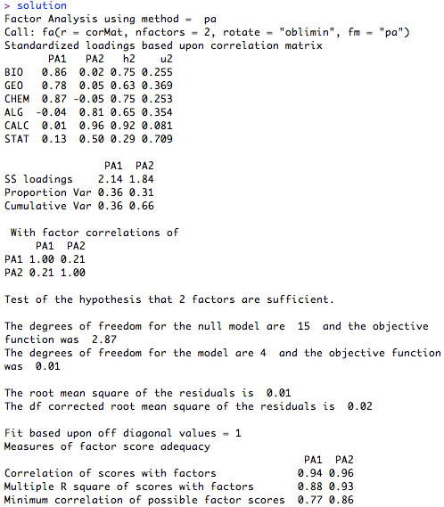 私達の因子負荷量を見ることによって、我々の要因の解決策を評価するために始めることができます。 私たちは、BIO、GEO、およびCHEMはすべて第一の要因(PA1)で約0.8高い因子負荷量を持っていることがわかります。 したがって、我々はこの因子の科学を呼び出し、それに科学の主題で学生の興味の代表を検討するかもしれない。 非常に我々は数学を呼び出す可能性のある第二の要因(PA2)、上同様に、ALG、CALC、およびSTATの負荷。 STATは、ALGまたはCALCよりPA2上はるかに低い負荷を持っており、それが要因PA1にわずかな負荷を持っていることに注意してください。 これは、統計が代数と微積分よりも数学の概念にあまり関係していることを示唆している。 単に負荷のテーブルの下に、我々は、それぞれの要因が、学生の主題の設定で全分散の66%を占める要因の解決につながる、応答の分散の約30%を占めていることがわかります。 最後に、私達の要因が0.21で相関していることに気付くと斜交回転の私達の選択は、この関係の認識に許可されることを思い出してください。