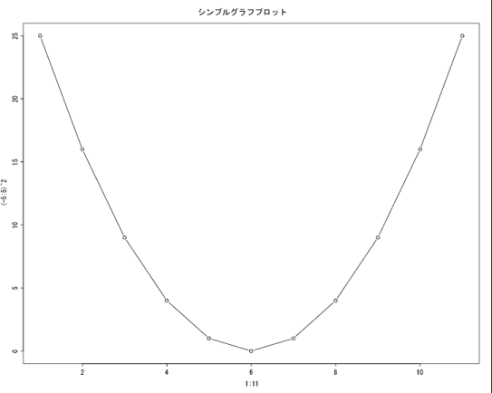 devSVG(file = "/temp/Rplots.svg", width = 10, height = 8,bg = "white", fg = "black", onefile=TRUE, xmlHeader=TRUE) plot(1:11,(-5:5)^2, type='b', main="シンプルグラフプロット") dev.off()