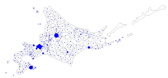 coords <- polycoords(hokkaido) xy<-sapply(coords, centroid) plot(hokkaido, col="grey") points(xy[1,],xy[2,], col="blue",cex=2*(hokkaido$P.NUM/max(hokkaido$P.NUM)),pch=19) #円ドット図表示