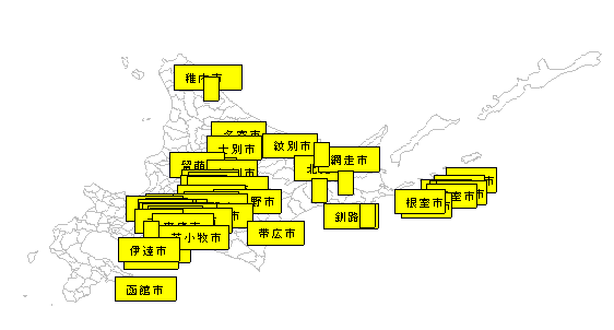 for(i in 1:length(hokkaidocity$CITY1)) legend(xy[1,i],xy[2,i], legend=hokkaidocity$CITY1[i], bg="yellow",cex=0.7)