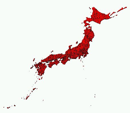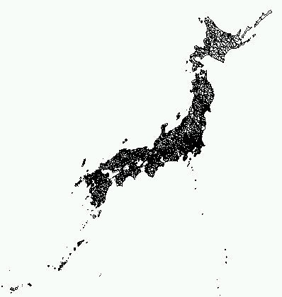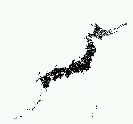 日本全図を表現するのに使用されている正距円錐図法(2標準緯線、中心経度:東経135度、中心緯度:北緯35度、第1標準緯線:北緯46度、第2標準緯線:北緯20度、距離の単位:メートル)で、行政界図を表示するには以下のようにします。