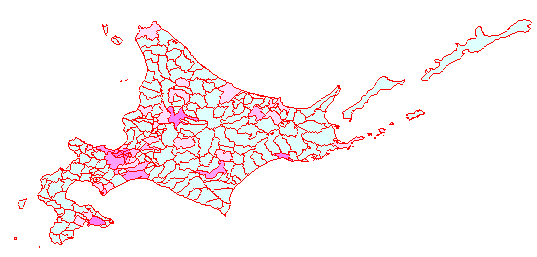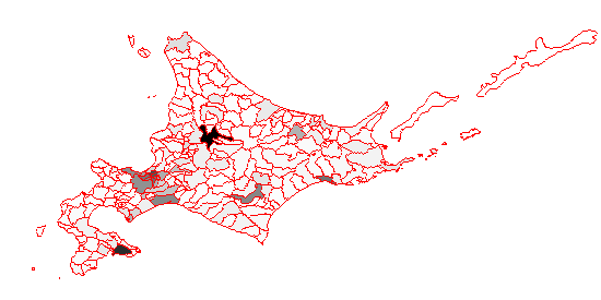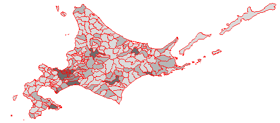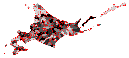 rangePop=range(hokkaido$P.NUM) plot(hokkaido,f=gray(1 - (hokkaido$P.NUM - rangePop[1])/diff(rangePop))) #地図を描く lines(hokkaido, col="red") #アウトラインを描く