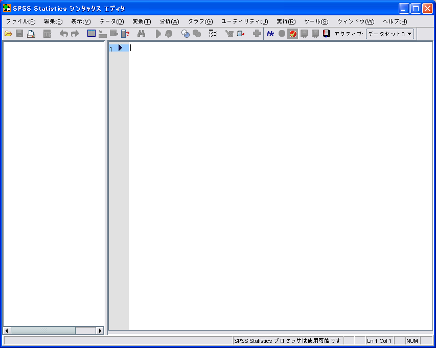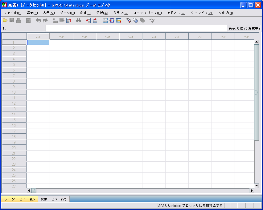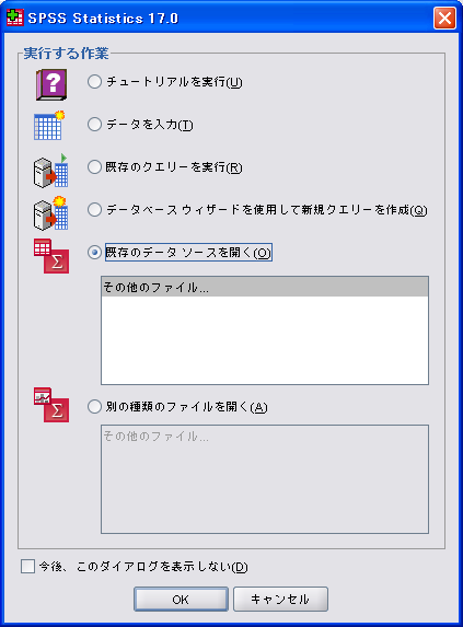 SPSS起動後、ダイアログが出るので[キャンセル]を押すと、データエディタ画面になる。
