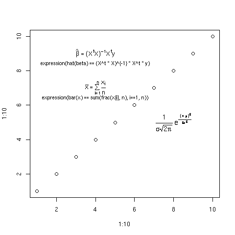 text(4, 8.4, "expression(hat(beta) == (X^t * X)^{-1} * X^t * y)",