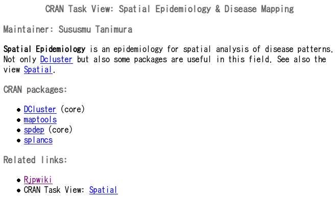 > x <- read.ctv("SpatialEpidemiology.ctv")