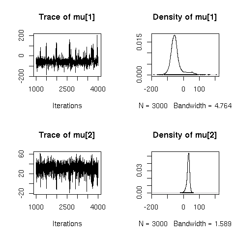 とJAGSへのパスが通っているかどうかチェックできる。baysemixに含まれるサンプルの一部を実行すると、次のようになる。