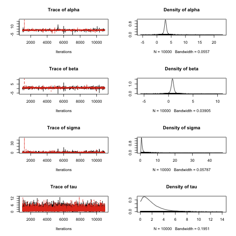 > x <- coda.samples(m, c("alpha","beta","sigma","tau"), n.iter=10000)