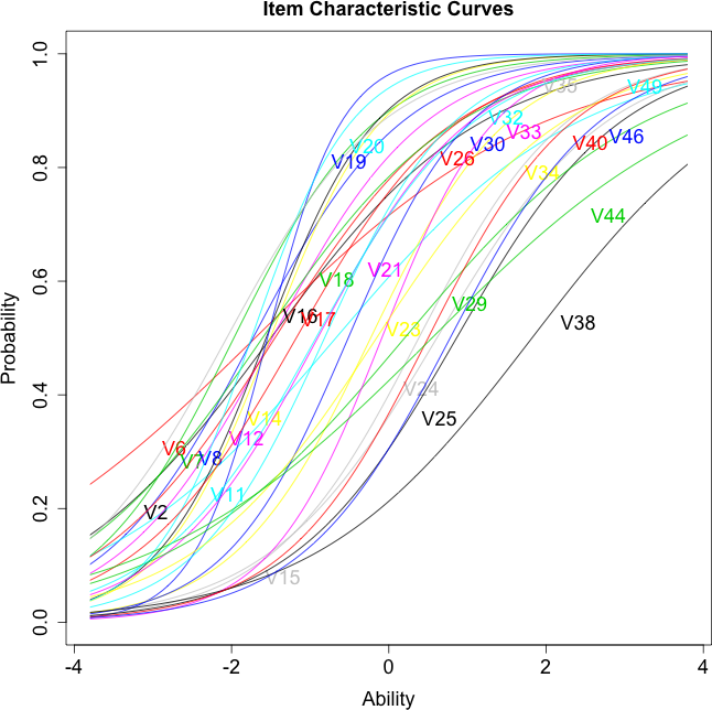 ltmではロジスティックモデルの定数項を1.0で推定するが、BILOG-MGなどでは一般にD=1.702で算出する。例えば豊田(2002)では識別力が0.574とあるが、ここでは0.973と推定される。結果を合わせるためには、識別力の推定値を1.7で割ればよい。