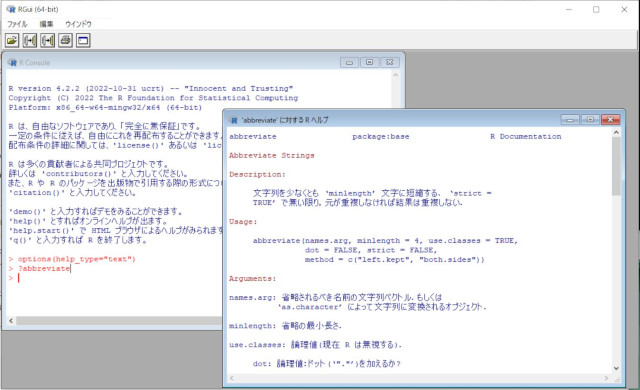 かつて間瀬先生となかまさんが取り組まれていたパッケージヘルプの日本語化ですが、R-4.2系でWindowsのデフォルト文字コードがUTF-8になったことで、以前はR側にも手を入れなければならなかった問題が解消しました。 基本的な手順は Windows版のRをビルドする方法 の通りで、追加作業は以下の2つです。R-4.2.2で確認しました。
