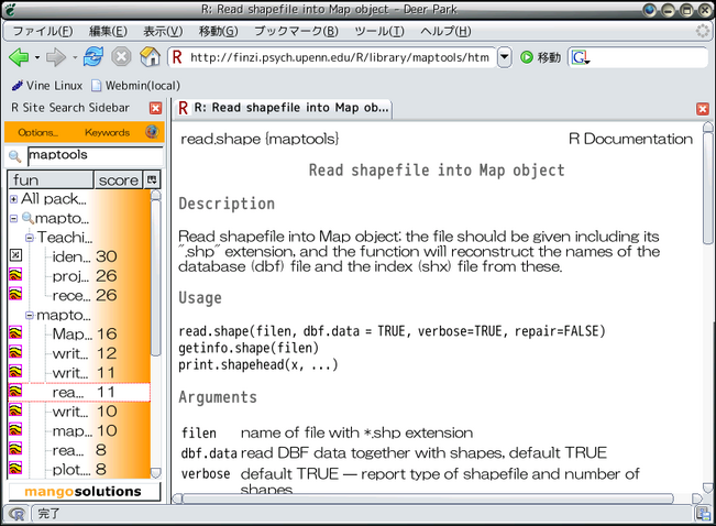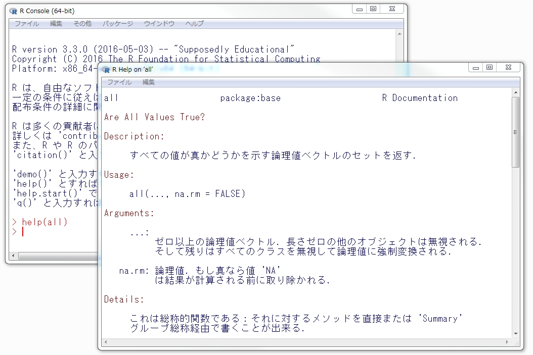ただし、RStudioのヘルプ画面に日本語版ヘルプを表示できず、デフォルトブラウザに出しています(通常の場所に置いてないヘルプを参照するため、他の関数のヘルプへのリンクも切れます)。