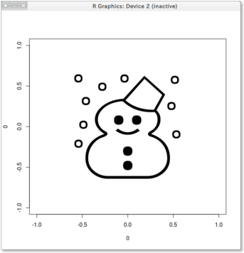 plot(0, 0, cex = 20, pch = "\u2603") # unicodeは\uで書くと安全です