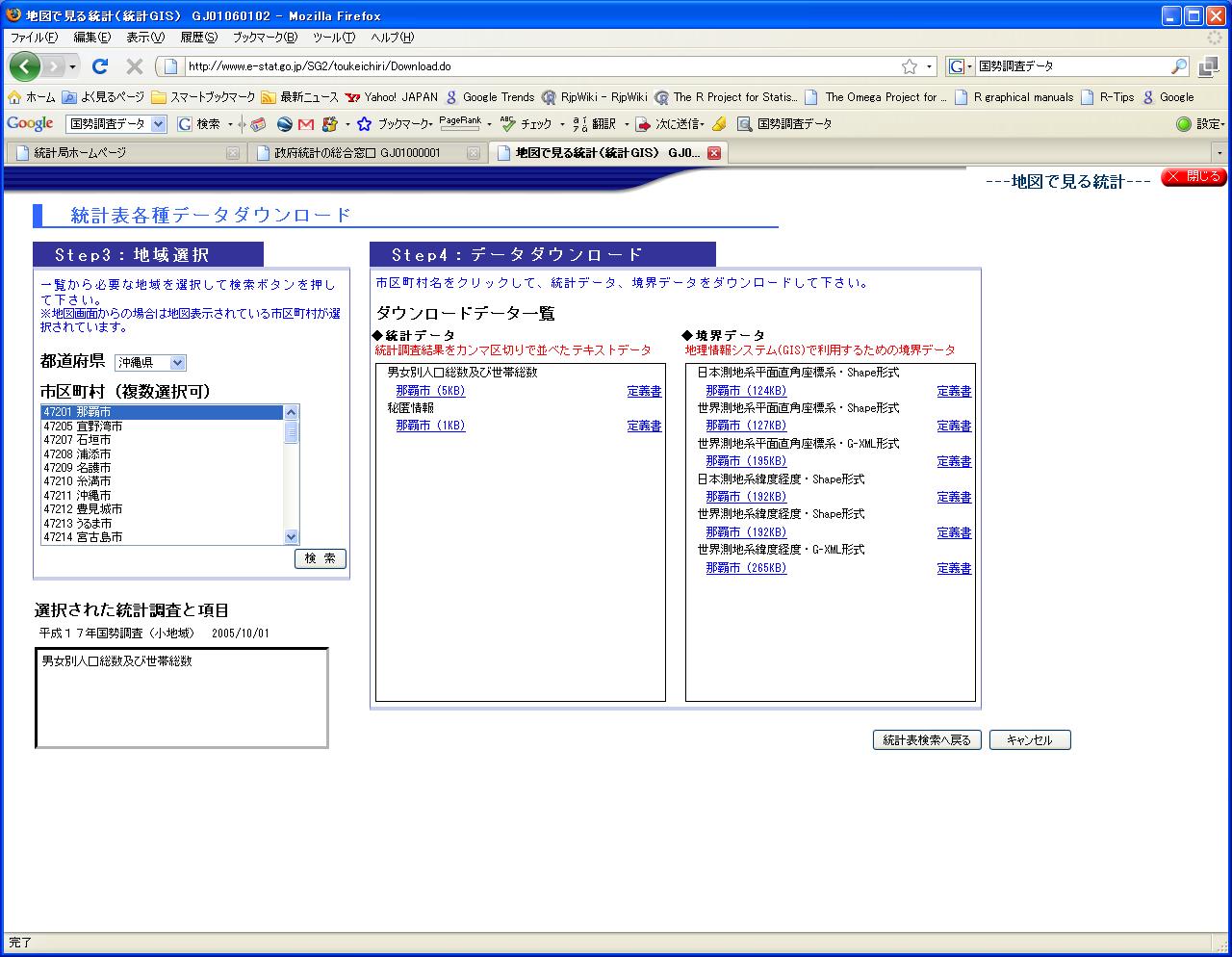 まず、那覇市国勢調査のデータ(平成17年)を地図で見る統計(統計GIS)のデータダウンロードから落とします。