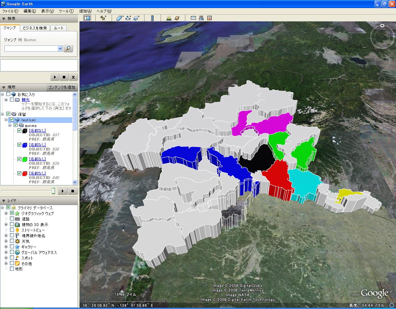 国勢調査データから作成したkmlはMultiGeometryタグが無いので、setAltitude関数をMG=Fで取り込みます。